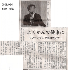 2008年6月2日(月曜日) 和歌山放送「むつろうの午後はなるほどっ!」が放送されました。当日は私の話のほかに、ラジオカーが” ダイワロイネットホテル和歌山”内のフランス料理レストラン「サンクシェール」から生中継をして、わたくしが福井料理長に 「固いものを固いと感じさせずに食べられる料理を作ってほしい」とお願いして実現したメニュー「ハニカミランチ(歯に噛みランチ)」 について放送されました。智ちゃん(リポーター)は役得で食べていたようです。 ラジオを聞いた人から早速「面白くためになった」 との反応がありました。それにしても睦ろうさん、話の展開がうまいですね!