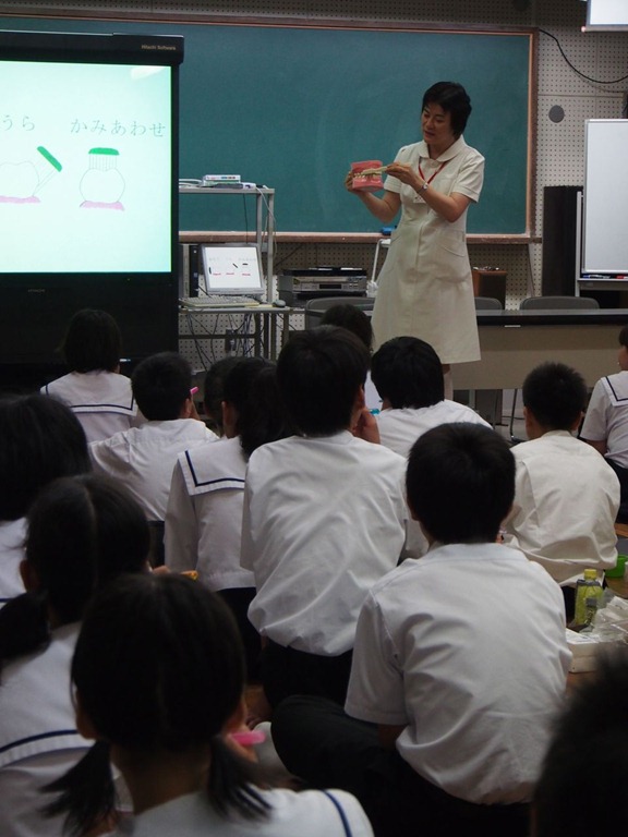 « 2012年06月 | メイン | 2012年08月 » 2012年07月 アーカイブ2012年07月04日動画2 視聴者の皆様へ2012年07月05日20120704伏虎中学校・口腔衛生指導毎年この季節に伏虎中学校1年生に口腔衛生指導をしています。和歌山県歯科衛生士専門学校から講師の先生に来てもらい、口腔についての知識と歯ブラシ指導をしてもらいます。このときに養護教員の高橋先生からすばらしいお話を伺いました。「今年4月の歯科検診で、1年生は65名中 う蝕 の本数が 5本 だけであった」。ということです。これは、ご家庭での注意や小学校で担任の先生や歯科校医の先生方の努力が効果をあげたということだと考えます。本当にうれしい話でした。中学校3年間でこれを保てるようにしていきたいと考えます。本日授業をしてくれた衛生士学校の清水富美子先生もベテランらしく(年はお若いのに)丁寧にお話いただき、生徒にはよくわかったようで、歯垢を染めた後の歯ブラシもとても熱心にしていました。私も最後に歯についてのお話をさせてもらいました。 授業風景 清水先生の熱心な指導 歯垢を赤く染めて、熱心に歯ブラシをしました。 2012年07月15日20120715岩出緑化センター・高野山2012年07月18日動画 第3回 生まれた時からのケア当医院のホームページ上でyoutubeの画像を貼り付けると重たくなるみたいなので、これからは私のyoutube 上の動画は、リンクを張りたいと思います。