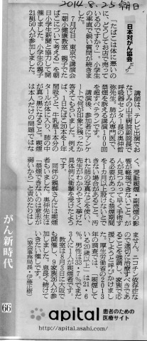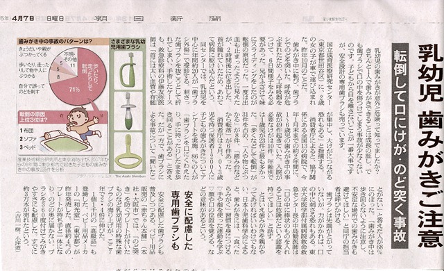 いかがででしたか? 当医院ではより来院される方に最適の治療が安心していただけるよう心がけています。 今回も最後までお読みいただきありがとうございました。 2014年09月24日新聞記事 乳幼児の歯磨き注意歯科治療と金属アレルギーぴんぴんころりん長寿社会になりました。しかし、寝たきりで長生きをするのは大変です。健康に関する知識は増えてきました。今までわからなかったために寝たきりになられた方は大変お気の毒ですが、これから気をつけることにより健康寿命を延ばすことができる時代です。あなたのために、そしてあなたのご家族のために少しでも健康でいられるように心がけたいものです。喫煙による健康被害は大変なものです。ぜひ早く禁煙できるようにして、健康を維持するように心がけてください。小学校へ禁煙授業に行って一番困るのは「こんなに悪いことがわかっているのにどうしてタバコを作るのですか?」という素朴な質問です。関連の新聞記事を添付します。ご参考になさってください。 |