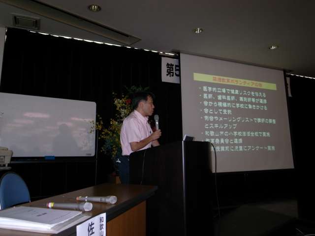 禁煙教育 ボランティア アーカイブ2007年10月04日20071004禁煙教育・砂山小学校2007年11月29日20071129和歌山市保健所健康教室2007年11月29日 和歌山市保健所 健康教室 で「お口から広がる健康 -歯垢を取ってプラス思考 -」 と題してお話をさせていただきました。予定数を超す市民の参加があり、皆さん熱心に聞いてくれました。 保健所歯科衛生士による楽しい歯ブラシ指導もあり、皆さん熱心に歯を磨いていました。おみやげに 歯ブラシ、歯間ブラシ、フロッスシルク (糸ようじ)や歯磨きペーストを皆さんもらいました。「とても為になった」というアンケートに記入いただけた方が多く、 講演後に話をした保健師も「アンケートがこんなに帰ってきて、記入欄にこれだけ書いてくれることは少ない」 と熱心な皆さんの反応に驚いていま した。写真は会場の風景です。