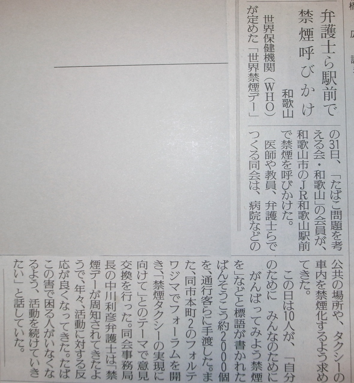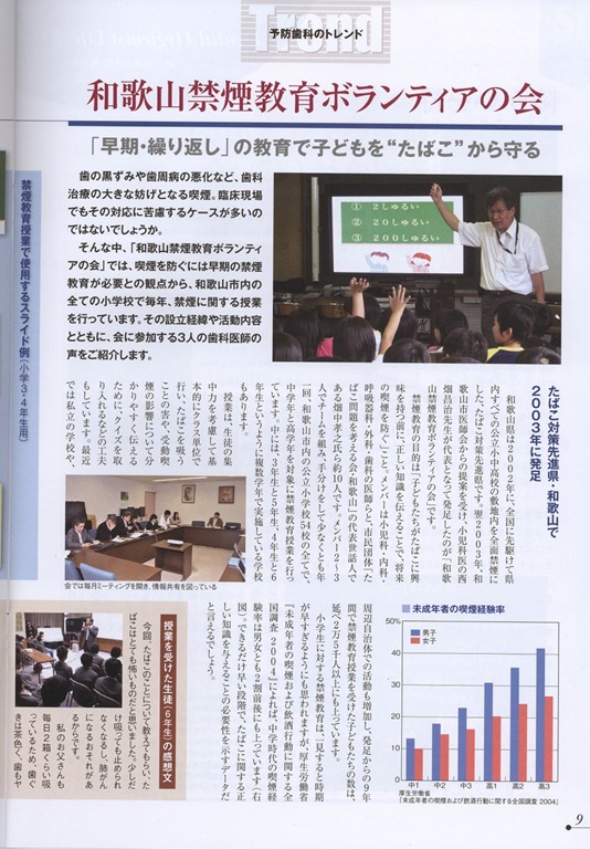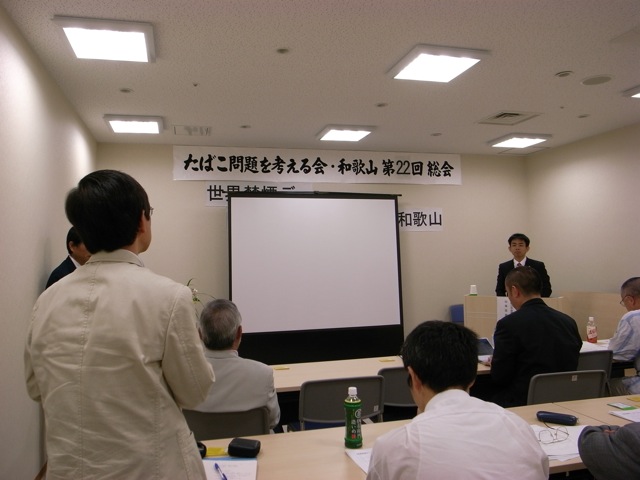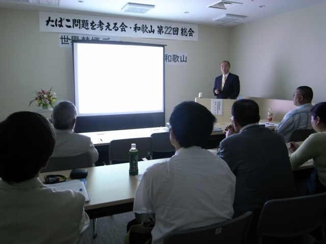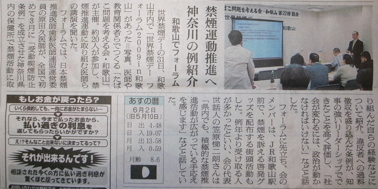 2009年03月18日2009年3月17日禁煙教育ボランティアの会2009年05月18日20090517第61回禁煙支援アドバイザー講座2009年06月05日20090530世界禁煙デー2009年5月30日 この日は世界禁煙デー 「タバコ問題を考える会和歌山」というグループがあります。20数年タバコ問題に取り組んでいます。5月30日には朝10時からJR和歌山駅前で禁煙に関する啓蒙の一環として、バンドエイドを禁煙の説明のついたパッケージで配りました。用意した3000部は「あっ!」という間に配り終えました。禁煙についての認識が多くの市民に芽生えていることを感じました。その後、午後1時30分から総会と講演会を本町二丁目の「フォルテワジマ(旧丸正百貨店)」4階の会議室で行いました。神奈川県で松沢知事が政治生命をかけて施行された「禁煙条例」の実施に参画された原田久医師が駆けつけてくれて「神奈川県受動喫煙防止条例制定までの道程」と題してすばらしい講演をしてくれました。同時に、和歌山市議会議員の山本忠相氏が「公共的施設の禁煙条例を全国に広げよう」という演題で講演してくれました。いずれもすばらしい話でもっとたくさんの方々に聞いていただきたく思いました。その後、湯浅保健所長の森岡聖次先生や空色タクシーの井手口貢氏も加わって「和歌山県における禁煙タクシーの実現に向けて」というシンポジュームが開かれました。とても有意義な一日でした。毎日新聞、朝日新聞、読売新聞、産経新聞などが取り上げて記事にしてくれました。 2009年07月05日20090702雑賀崎小学校禁煙教育2009年7月2日(木曜日) 和歌山市立雑賀崎小学校で4年生と6年生に禁煙教育をしました。