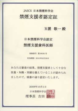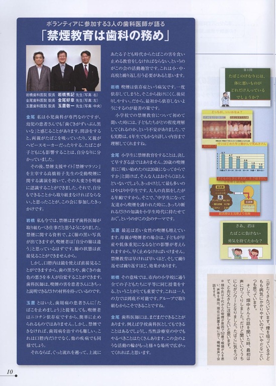 下の写真は、素晴らしい御講演をして下さった、宮崎で小児科医院を開業されている野田先生とインターネット禁煙マラソンの高橋先生。 野田先生は、会場のみんなを、「だ」じゃれで引きつけて、素晴らしい講演をしてくれました。 2008年10月01日20081001禁煙支援歯科医師の認定証2008年12月18日20081218山東小学校禁煙教育2008年12月18日山東小学校へ禁煙教育にいきました。このブログでおなじみの畑中さんとのコンビです。畑中さんは長くタバコを吸っていて、53歳の時に喉頭がんが見つかり、声帯を切除しました。そのために声が出なくなり、器械をのどに当てて話をします。畑中さんが話しはじめると、生徒はみんな水を打ったように「し~ん!」となり、聞き耳を立てて聞いているのがわかります。生徒さんたちの感想文の中に「(前略)・・・・お父さんとお母さんがタバコを吸っているのでとても心配です。次の僕の誕生日にはプレゼントはいらないので、お父さんとお母さんの禁煙をください。(後略)・・・・・」というのがありました。お父さんとお母さんへのやさしさにあふれています。人を思いやる心を持ったこの子供たちがそのままで大きく成長できるようにと願ってやみません。 畑中さんの授業風景 私が生徒さんたちに質問しているところ。 2009年01月30日20090129和歌山市立楠見東小学校禁煙教育2009年1月29日 和歌山市立楠見東小学校へ禁煙教育にいきました。畑中さん(喉頭がんのために声帯を切除して、器械を使わないと会話のできない方です)と一緒に行きました。とてもはにかみやですがまじめな生徒さんたちで、最後に畑中さんに器械の使い方を教わっていました。また、校長先生の南方先生は、私の娘が小学校1年生の時に担任してもらい「南方先生に担任をしてもらいとても好かった」と今も話に出るような生徒思いの先生です。先生手作りのゲームが校長室の前に置かれていたり、古電柱にバスケットボールのゴールをつけた運動具が運動場にあり、また、トイレには「こちらを向いてスリッパを脱いでね!」という人形があり、お金をかけずに子供の「知育、体育、徳育」に励んでいる姿に、時間がたってもちっとも変わらない先生の生徒思いがびんびん伝わってくる小学校でした。後日いただいた感想文で「僕のお父さんもお母さんもタバコを吸っています。今年の僕の誕生日のお祝いはいらないから、お父さんとお母さんの禁煙がほしいです」と書いてくれた生徒さんがいました。こんなに心優しい生徒が育つ学校はすばらしいと思いました。そのときの写真です。クリックして大きくしてみてください。