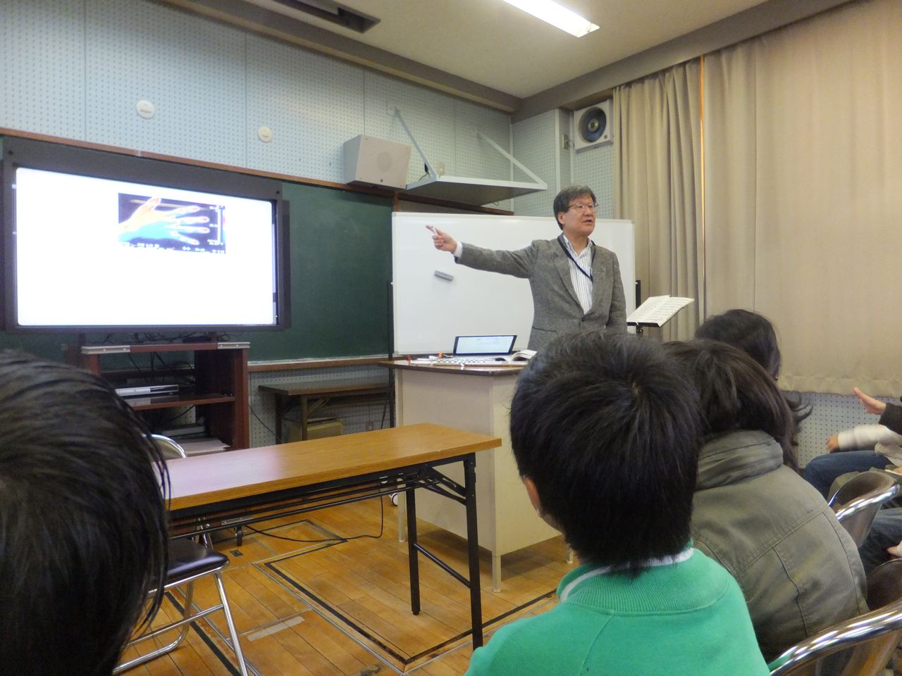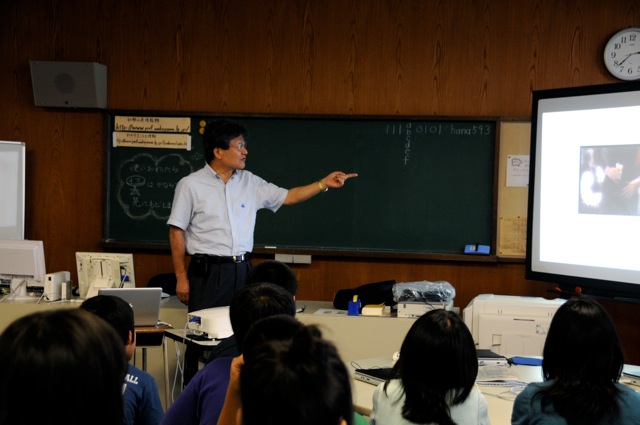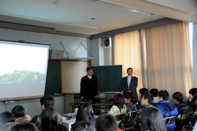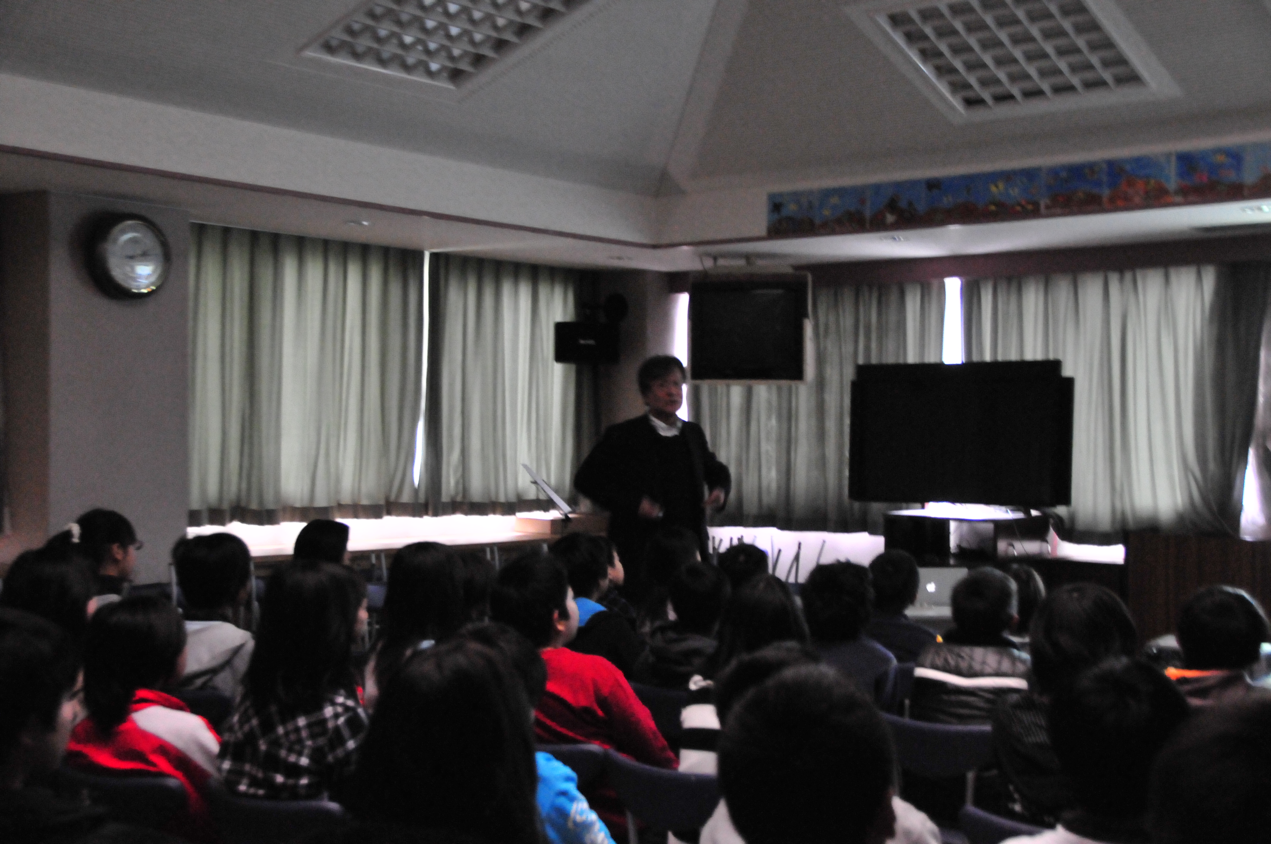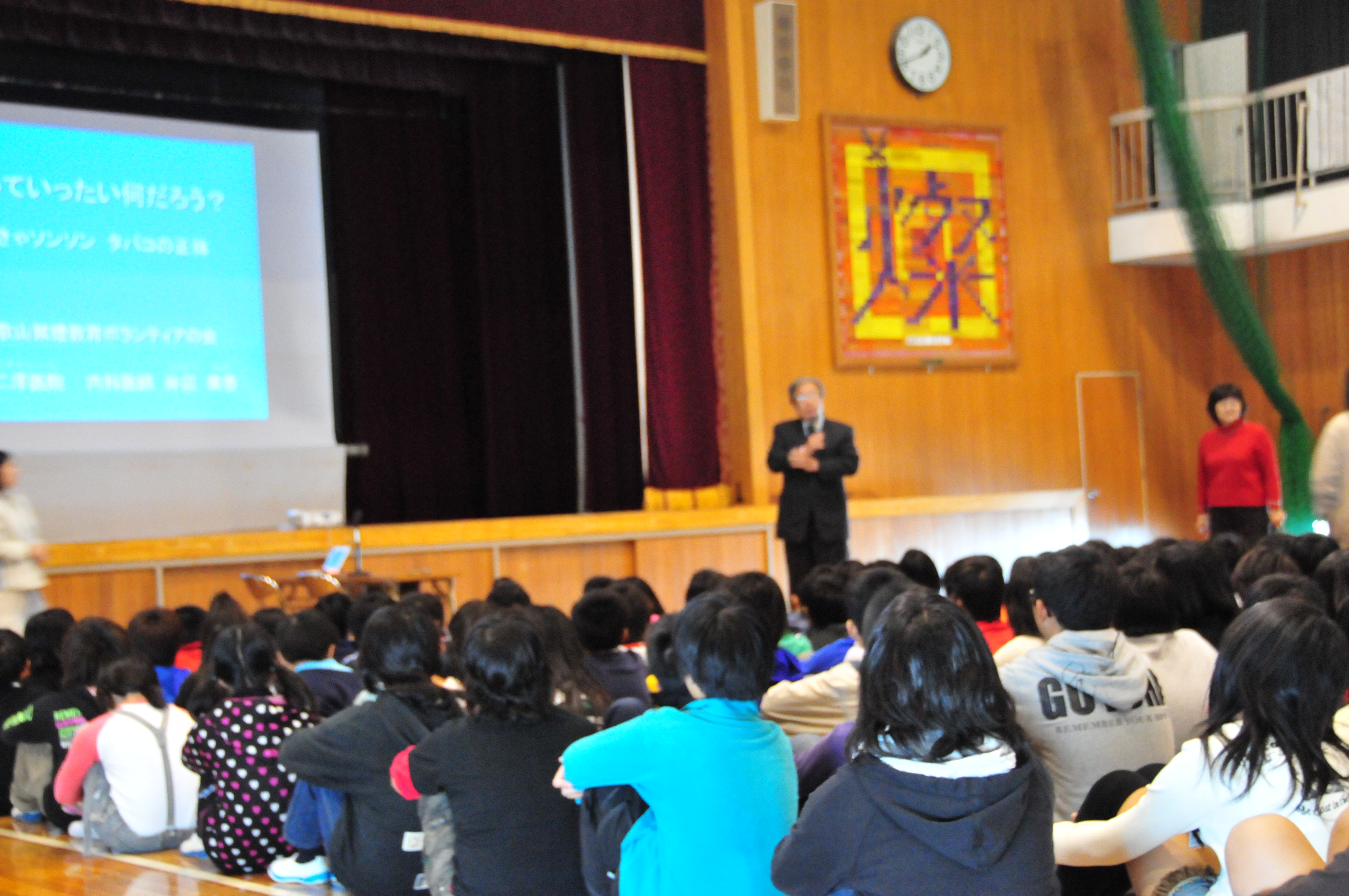宮小学校での畑中さんの授業風景。 写真をクリックすると、拡大されます。 2011年12月19日20111220禁煙教育ボランティアの会月例ミーティング2011年12月20日(火曜日) 禁煙教育ボランティアの会月例ミーティング 本年度最後のミーティングで、禁煙科学会会長で奈良女子大学教授の高橋裕子先生も奈良からわざわざ車で駆けつけて下さいました。本年も和歌山市立小学校のほとんどすべて(一部警察や保健所が授業をしてくれています)で授業ができ、しかも、、複数学年(4年生と6年生など)の授業をできた小学校が増えてきました。その他に海南市の小、中学校でもだいぶん授業ができるようになったこと、など本年もずいぶん収穫がありました。そのあと家庭の教育論、初等教育、高等教育、さらに、大学の教育のあり方について夜の更けるのも忘れて、遅くまで食事をしながら楽しく時間を過ごしました。 このあと高橋先生は前回和歌山へいらっしゃったときに見つけた特産・産地直送みかんのお店に寄り、奈良にお帰りになったのは「ずいぶん遅かった」とのこと。いつも和服をお召しになり、大学の会議のあと和歌山までお越し頂き、本当にありがたく感謝しております。 2011年12月21日20111208禁煙教育・和歌山市立山東小学校2011年12月08日(木曜日) 和歌山市立山東小学校に禁煙教育で行きました。 6年生50名 とても静かに聞いてくれ、45分授業だったのですが、次の時間を感想文を書く時間に充ててくれていたので、60分近くお話しをし、事前アンケートの中の質問に答える時間が無くなったので担任の先生に「どうしましょうか?」と聞くと、先生より先に何人かの生徒さんが「もっと聞きたい」と声を上げてくれ、先生も仕方なく(かな?)「では続けて下さい」と言ってくれるほど熱心に聞いてくれました。養護教諭の松尾先生も今年から山東小学校に赴任されたのですが、とても熱心な先生で、事前アンケートの集計や、生徒の質問をまとめてくれ、授業がとてもスムースにできました(昨年まで養護教諭をされた増井先生も同様にとても熱心な先生で、生徒思いの養護教諭が続き、授業をさせて頂く私も、行かせて頂くのが楽しみです)。その上、授業後のアンケートばかりでなく、授業後のアンケートもとって下さり、集計をグラフにして送ってくれました。感想文とグラフを見ると、生徒が授業内容をいかにキッチリと把握してくれたかがよくわかりました。授業の中で「たばこを吸わないというのは仮の目標。命を大切にすると言うのが本当の目標」ということを言ったのですが、授業の中でもそのことを把握してくれており、感想にも書いてくれていたのでとてもうれしく思いました。日常の授業の中で先生方がそのようなポイントを把握できるように生徒を指導しているのがよくわかりました。以下に授業風景を添付致します(会場が真っ暗な中で、松尾先生が撮ってくれたもので、真っ暗な中ではよく写してくれました)。 写真をクリックすると、拡大されます。 2012年01月20日20120119禁煙教育・楠見東小学校6年生2012年1月19日(木曜日) 和歌山市立・楠見東小学校6年生の禁煙教育に行きました。 6年生3クラス79名で、とても熱心に聞いてくれたので楽しく授業ができました。ただ単に「たばこを吸わない」と言うことだけでなく「健康の大切さ、命の大切さそして友達や周りの人と仲良くすること」など授業内容をキッチリ把握して答えてくれて、うれしく思いました。 小学校でテレビのような大きな画面にパソコンから直接映し出せる器械が導入されており、プロジェクターよりも美しい画面で見ることができました。ただ、レーザーポインターが移せないので、画面の注目してもらいたいところを指で指さなければならないのが玉に傷でした。写真は授業風景です。 授業が終わってから校長先生とお話しをさせていただき、「来年も3年生と6年生の授業ができるようにして下さる」とのことでうれしく思いました。また、この小学校は以前の校長先生がいろいろ生徒のために知恵を絞って学校整理をされた学校で、「生物観察ができるように」と作った「トンボ池」があったり、とても使いやすい図書室があるところですが、その図書室でPTAの方々が生徒に「読み聞かせ」をされているようです。また、以前の校長先生が「私の代では無理なのですが、屋上に太陽光発電を付けて、生徒に電気の仕組みや、節電のことについて考えるようにしたい」と言っておられたのを思い出して「その後どうですか」と聞いてみると、既に実現して、生徒が屋上で太陽パネルを見たり、校舎に入ってすぐのところに発電量や電気消費量がわかるようなメーターパネルが設置されているそうです。先生方の努力が実を結んでいるのを見てとてもうれしくなりました。 2012年02月17日20120216紀の川市立中貴志小学校へ禁煙教育2012年2月16日(木曜日) 紀の川市立中貴志小学校で「禁煙教育」と「PTA教育講演」そして「学校保健委員会」の合同授業をしまし