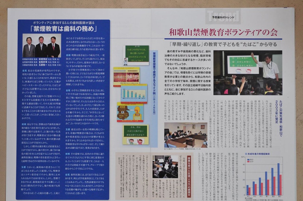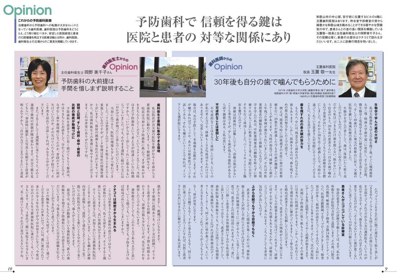 2011年01月14日20110114うれしい患者さん2011年01月14日 以前から通って下さっている患者さんで、今日いらっしゃった患者さんに「今年のおせち料理とお餅はいかがでしたか?」と伺うと「歯を治してからよく噛めるようになり、正月はおいしくいただけました。おかげでちょっとからだが太りました」とおっしゃいました。それで、奥歯でキッチリ噛めるようになると、自律神経系や運動神経系が正常に働くようになるために、冷え性が無くなったり、肩こりが少なくなるとか身体のいろんなところが良くなっていきますよ!」と申し上げたところ、「それでか。このところ身体の調子がいいのは!」といってくれました。ある会社の会長さんですが、「今でもデスクワークだけでなく、1日3時間は現場へ出て仕事をしている(現場ではいやがっているかもしれないけれど)」と言っておられました。この会長さんは話をさせて頂いている感じでは、現場はちっともいやがっていないと思います。本をよく読まれて、異業種交流にもよく出席される、すばらしい会長さんです。お話しをさせて頂いた後とてもすがすがしい気分になりました。 2011年02月09日20110209診療室見学2011年02月08日 大阪から見学に来てくれました。 大阪のほうで多くの患者さんを集め、がんばって診療している診療室から見学に来てくれました。昨年暮れに院長と事務長がこられ、当院で使用している患者さんの管理ソフト(Dental X: デンタルテン)をご覧になり、以前から予防歯科を目指していましたが、さらに良質の医療をしたいと考えて、私たちが長年にわたり患者さんのデータを取り、管理し、それを長期にわたって患者さんの歯を維持することに使っているのをご覧になり、今回、代診の先生、歯科衛生士と歯科衛生士主任、訪問看護主任そして事務長の5名でいらっしゃいました。 当院のシステムをご覧になりとても喜んでいただきました。このように日本全国で予防を心がけ、患者さんの歯をなくさないように努力する歯科医院が増えることを願っています。8020運動とはまさにこのような治療をすることです。皆さんもぜひご自分の歯が悪くない間に歯科医院を訪れ、健康で快適な生活をお送りください。 写真は見学の様子と、そのときに来院していた患者さん(お子様)が治療中に眠ってしまい、寝たまま(小さいいびきを書きながら)治療を受けているところです。 熱心にメモを取り聞いてくれていました。 当院のスタッフが、説明していました。 最初は歯科医院が大嫌いで、玄関でおお泣きして待合室にも入れなかった「アン」チャン。今はこんなに安心してぐっすり寝たまま治療できるようになりました。